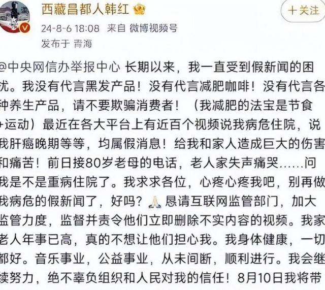 官方通报洗清了韩红的冤屈,但她并未选择起诉追责或公开争辩,而是迅速回归公益工作。在后续的采访中,韩红曾提及此事,言语间偶有哽咽,却始终表示 “对得起良心就够了”,这份坚守成为她此后公益之路的底色。