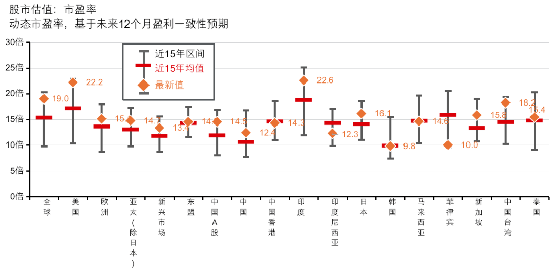 资料来源:FactSet,中证指数有限公司,明晟(MSCI),标准普尔,摩根资产管理。图表中美国股票的估值数据基于标普500指数,中国A股的估值基于沪深300指数,其他各地区股票的估值数据基于该地区的MSCI指数。市盈率及市净率以本币计价计算。过往表现并非当前及未来业绩的可靠指标。《环球市场纵览-中国版》。反映截至2025年12月31日的最新数据。
