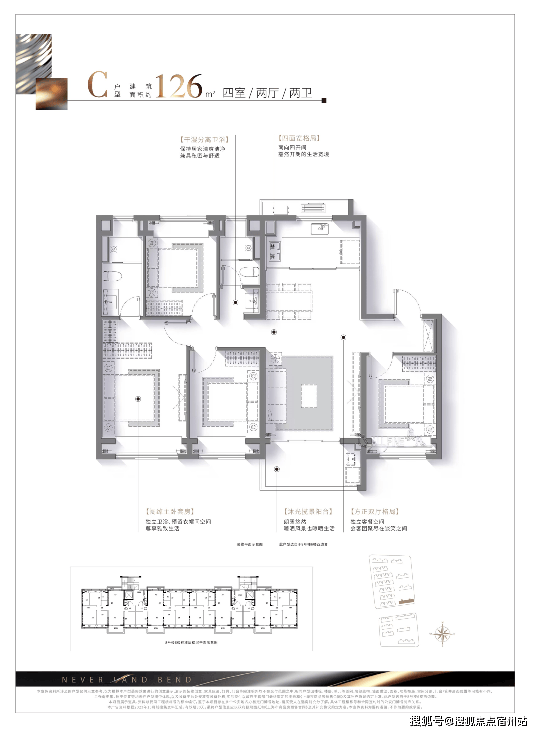 建面约126㎡真四房,进一步强化功能性,户型方正,四开间朝南,南北通透,南向卧室均带有大飘窗设计,拓宽了室内景观视野的同时,增加了实际空间使用率,有效避免面积浪费。