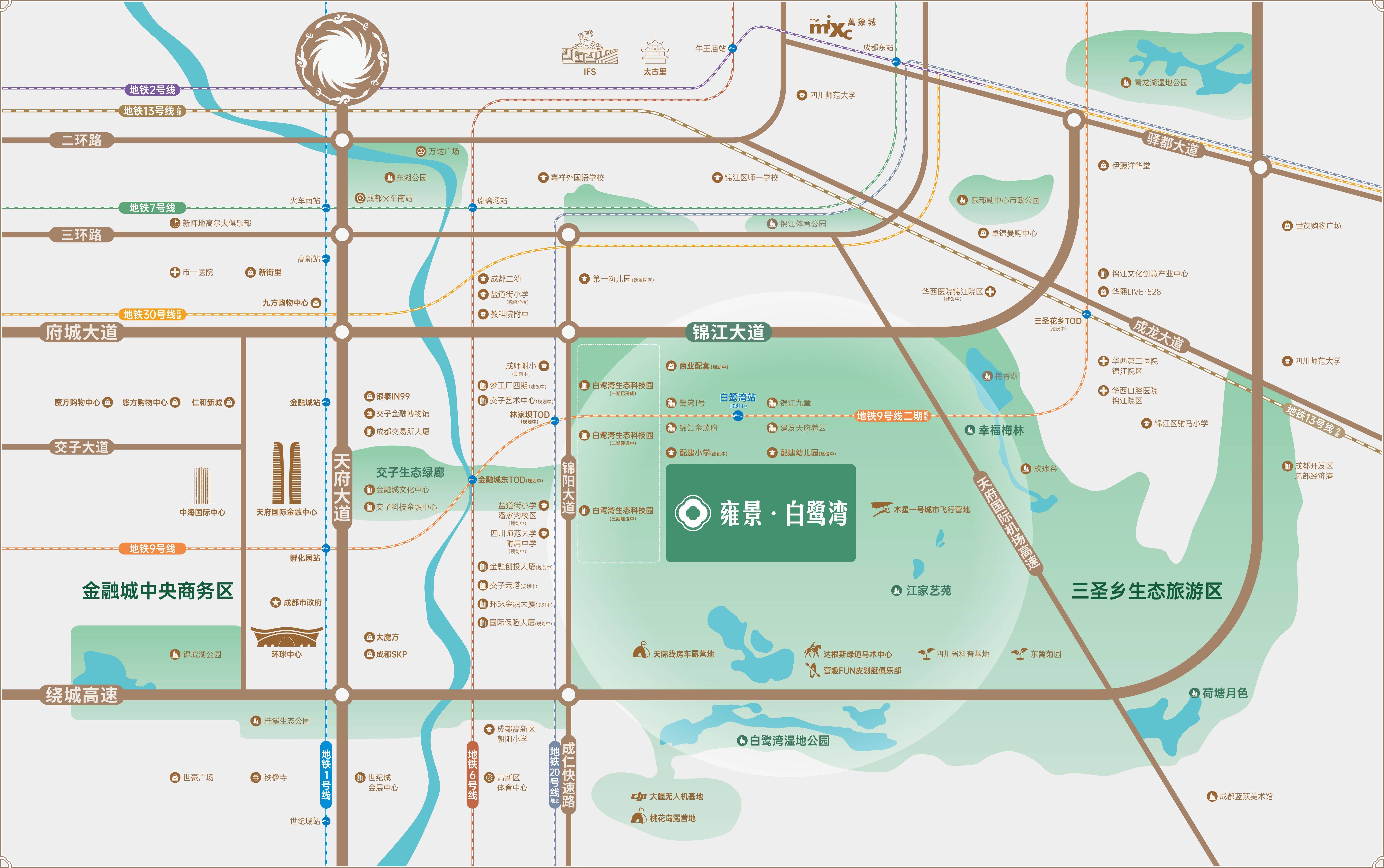 交通:拥有 “三横四纵” 的交通网络,三横为三环、锦江大道、绕城高速,四纵是天府大道、锦阳大道、天府国际机场高速、成龙大道。此外,项目还处于双地铁覆盖区域,地铁 9 号线 期白鹭湾站(规划中)、地铁 20 号线林家坝站(规划中)。