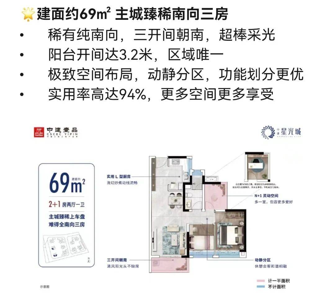 产品:项目总体南低北高,保证日照需求,蝶形设计,保证户户朝南,围合式布局,保证户户望园林。中建星光城分两期建设,目前在售69㎡-100㎡户型。