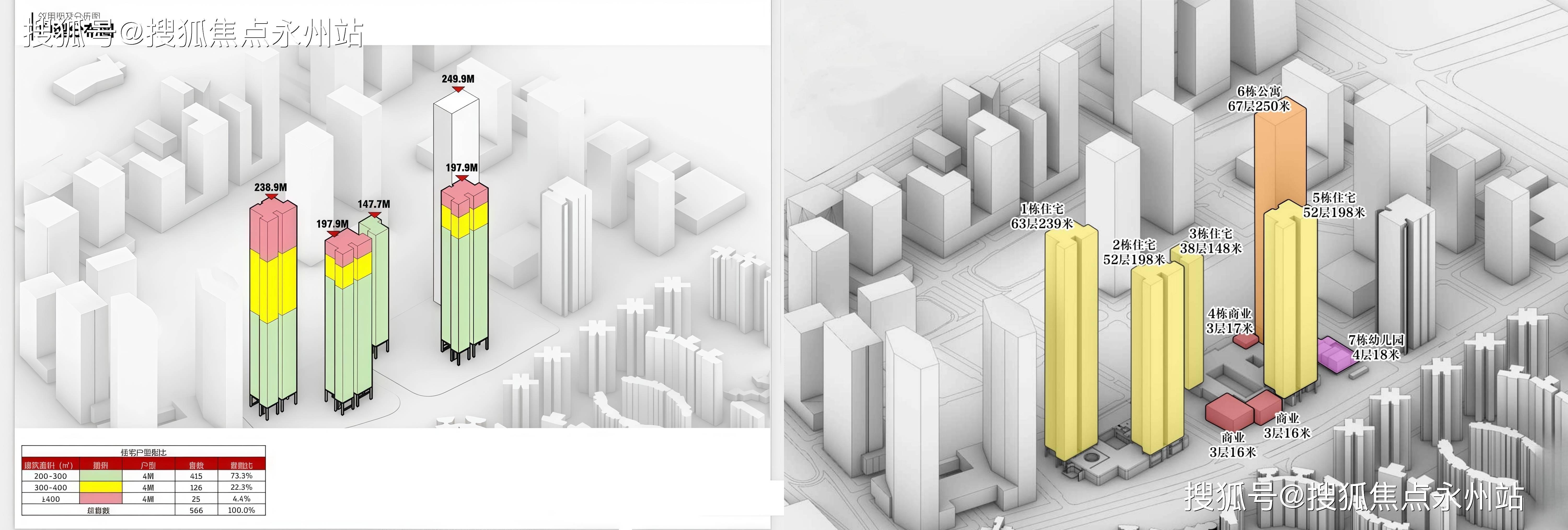 规模规划:占地3.85万㎡,总建面26.3万㎡,由5栋超高层塔楼组成(4栋住宅+1 栋公寓),住宅主力户型为209-1050㎡纯粹大平层,共601套,容积率7.59,限高250米。