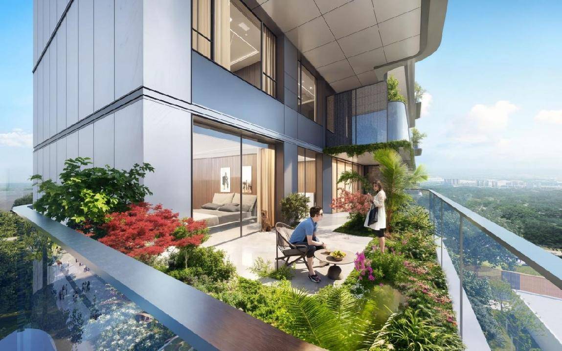 大平层户型。楼间距达到约39-58米,视野无比开阔。最大的亮点是南向约13.9米的巨幕露台和最大约23.2米的超宽面宽,搭配南北双阳台,将湖光山色引入室内。层高约3.3-3.5米,空间感十足。客厅、餐厅、厨房与花园阳台无缝联通,形成开阔的LDKGB一体化空间。更特别的是,露台做了约60公分的降板设计,预留了覆土空间,每家每户约52-88㎡的空中花园,可以由你亲手打造成私家园林或阳光茶室,实现了真正的空中花园大平层梦想。
