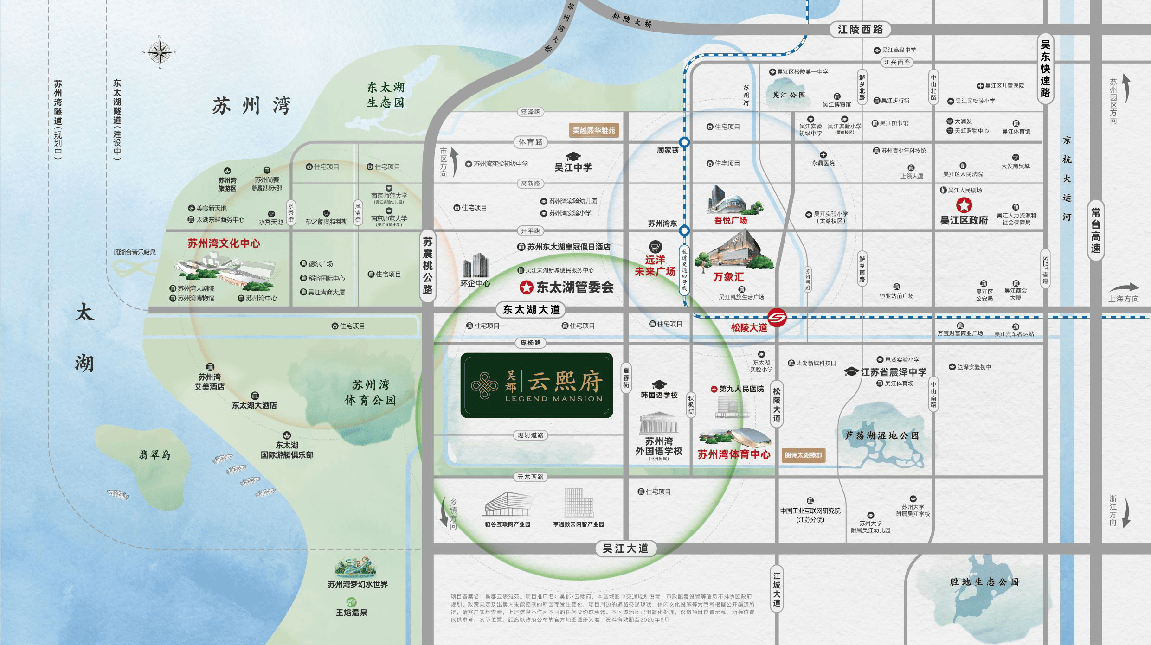 的生态圈,东太湖生态园、体育公园就在家门口,推窗即是约50平方公里的纯住区和约20公里的湖岸线。生活极其便利,万象汇、吾悦广场等大型商业举步可达,文化中心、大剧院、体育中心更是信步即至。孩子上学有苏州湾外国语学校等一众名校环绕,家人健康有苏州市第九人民医院(约1公里)保驾护航。出行方面,地铁4号线、东太湖大道等主干道环绕,未来还有东太湖隧道、苏州湾隧道加持,四通八达。选择在