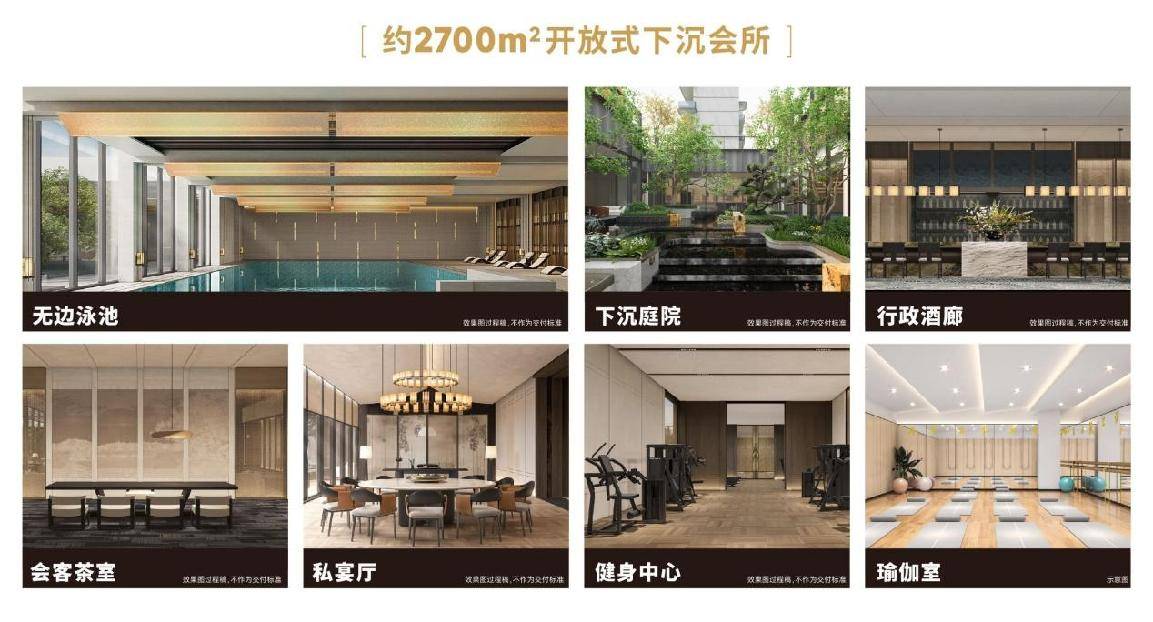 社区内,每栋楼都有精心打造的架空层泛会所,设置了艺术、亲子、茶艺等9大主题空间,满足全龄段休闲需求。更令人心动的是约2700㎡的开放式下沉会所,内含无边泳池、行政酒廊、私宴厅、健身房等,完全是峯层人物的私享领地,为业主提供了顶级的